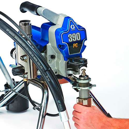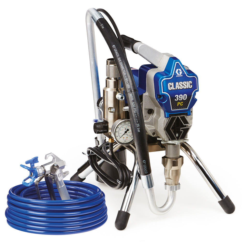 Монтираната на стойка маина Graco Classic 390 PC е лека, компактена машина за малки проекти на закрито. С тегло само 14 кг и компактни размери, тя е лесна за транспортиране с малко усилия. С дебит от 1,8 литра в минута безвъздушната машина може да се използва предимно за работа на закрито с бои, грундове или други дисперсии. Graco Classic 390 PC е особено подходяща за малки фирми или работа от един човек. Класическият модел Graco 390 може да се използва и като втора или резервна машина, което я прави полезно допълнение за средни и големи компании с големи обеми за боядисване.
