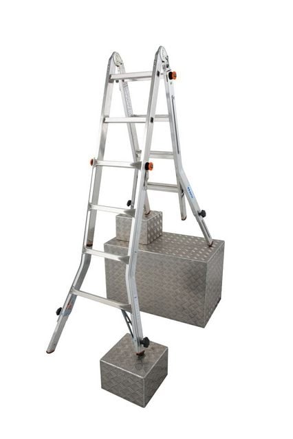 Easy-to-Use Ladder with multiple functions: free-standing double-sided ladder, leaning ladder, ladder with adjustable base height, or work platform (when used with the TeleBoard – sold separately). Equipped with four extendable side rails to compensate for base height differences.
