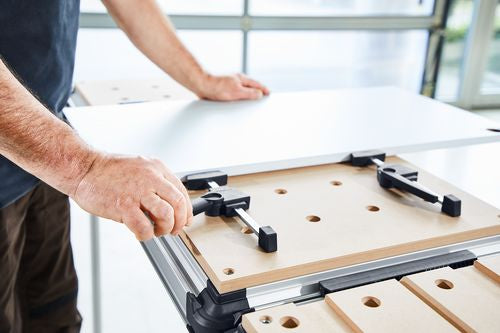 - Стабилен работен плот от перфорирана плоча и алуминиев профил, която предлага гъвкави възможности за захващане и фиксиране