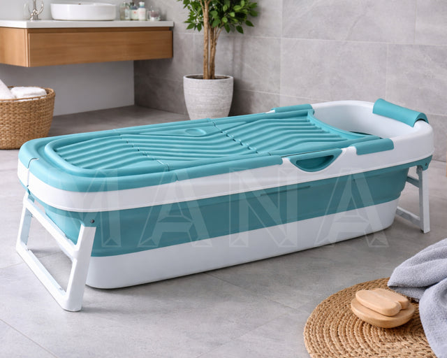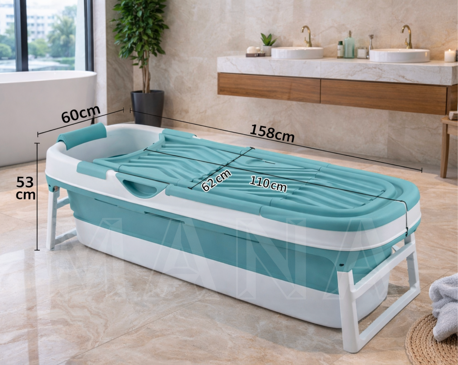 Сгъваема вана с размери 158 × 60 × 53 см, изработена от екологично чисти и безопасни материали, подходяща както за възрастни, така и за деца.