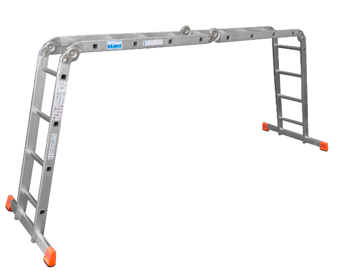 Многофункционална сгъваема стълба KRAUSE MultiMatic 4x4 – свързана посредством самоблокиращи се панти (стави), позволяващи да се работи с различни конфигурации на стълбата. Стъпалата са изработени от квадратен рифелован профил предотвратяващ приплъзването, свързан с носещите рамена посредством многократна пресова сглобка. Окомплектована с две допълнителни основи (траверси) за по-голяма стабилност.