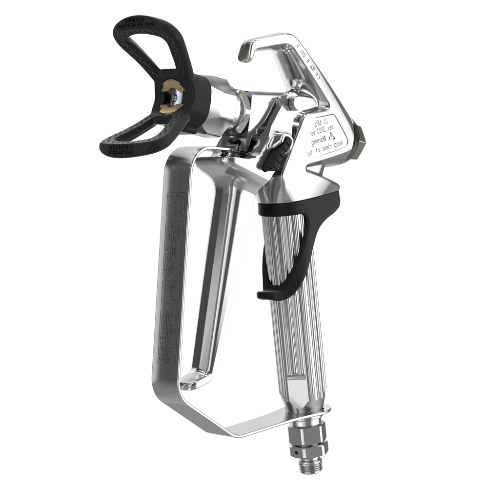 • С държач на дюзата TradeTip 3 - Вдлъбнатините на обратната страна на държача на дюзата намаляват турбуленцията на въздуха и осигуряват перфектен модел на пръскане. Изключително широкият ъгъл предотвратява отлагането на боя.